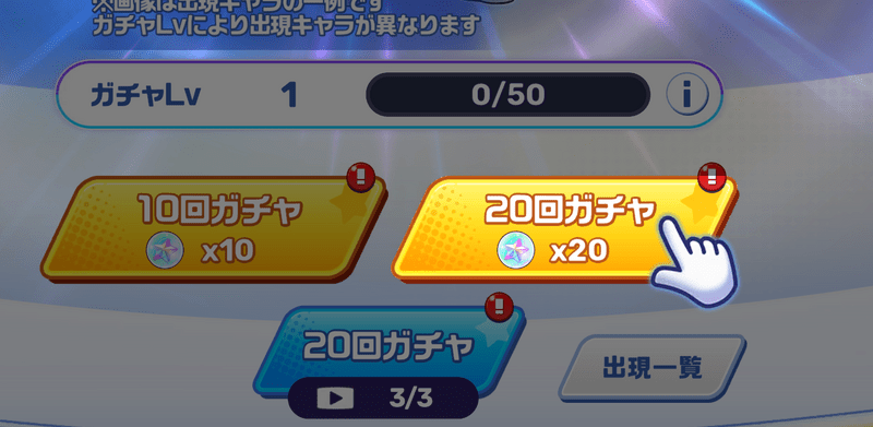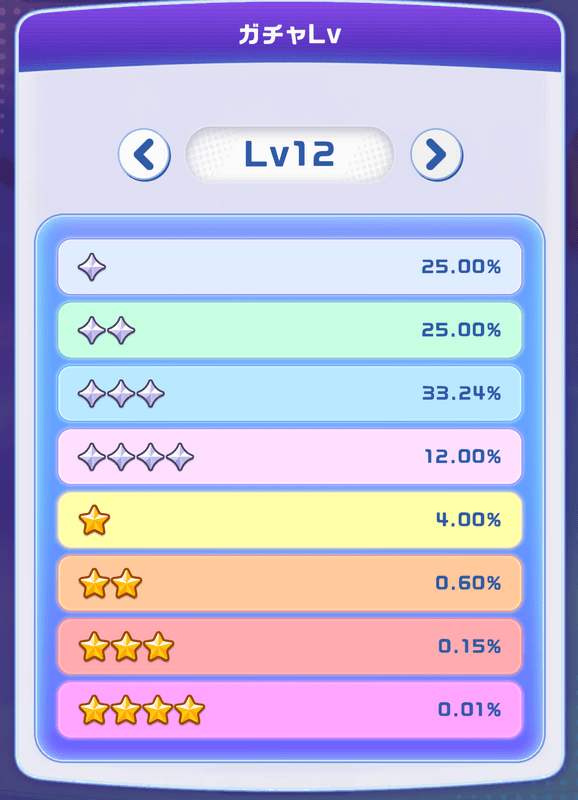 ガチャは回すごとに確率が変動するタイプのため、ガチャLv12まで上げないと最高レアである「ゴールデン星4キャラ」を引き当てることが出来ません。