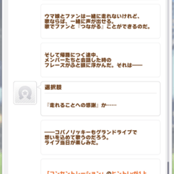 | スキル効果 | レース後半に前の方だと速度が上がり、さらに加速力がわずかに上がる。ファンが多いほど効果が高まる |