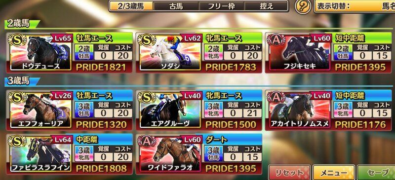 | 終了基準 | コース適正が違うS馬3体以上 or SSランク馬2体以上 |