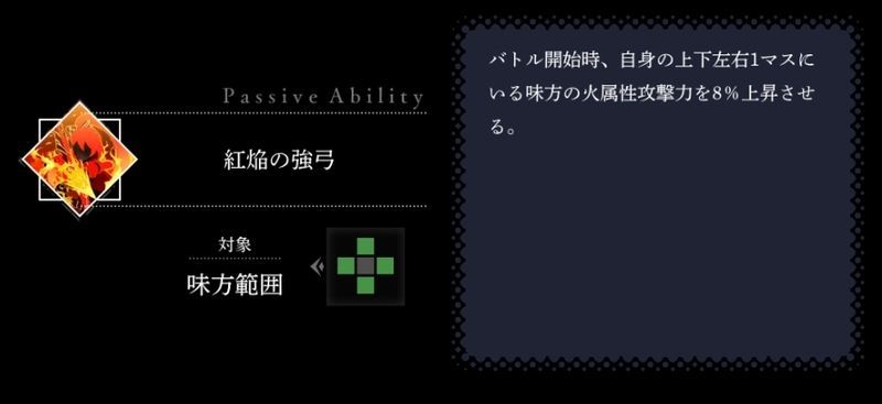 | バトル開始時、自身の上下左右1マスにいる味方の火属性攻撃力を8%上昇させる。 | |