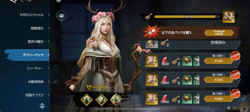 | 初回 購入ギフト 1日目 | 英雄「イヴェット」 建築加速(8時間)×3 食料×450,000 木材×450,000 | 160円 |