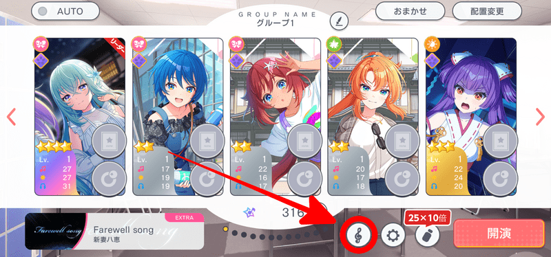 センスの発動タイミングは楽曲挑戦前の🎼をタップで確認できます。発動タイミングを見つつ、上記編成画面で編成を調整しましょう。