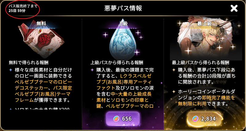悪夢コインはパス進行度を購入することができ、購入しているパス(無料、上級、最上級の3種類)状況によって報酬を受け取ることができます。