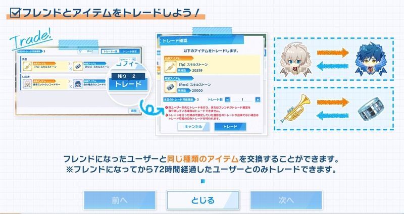 フレンド同士だと、同じ種類のアイテムを交換することができます。育成素材で余ったアイテム、足りないアイテムをお互い交換しましょう!