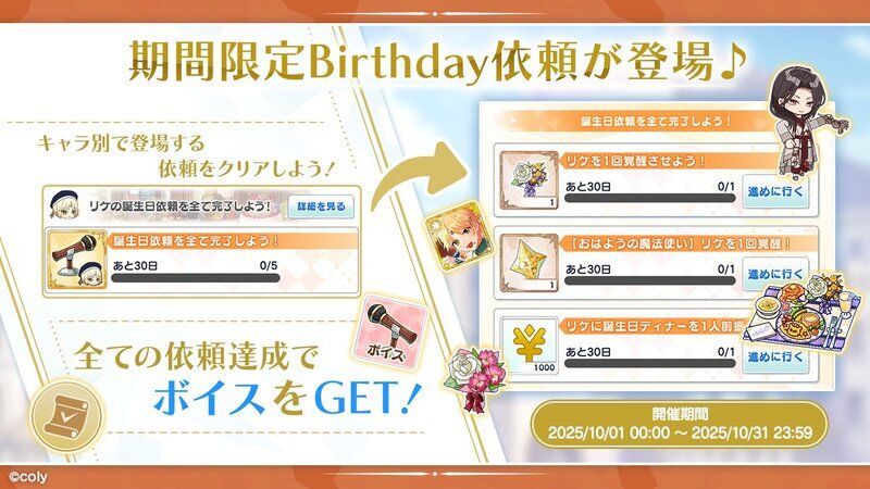 『目覚ましボイス』は、期間限定の誕生日依頼をクリアすることで獲得できます。