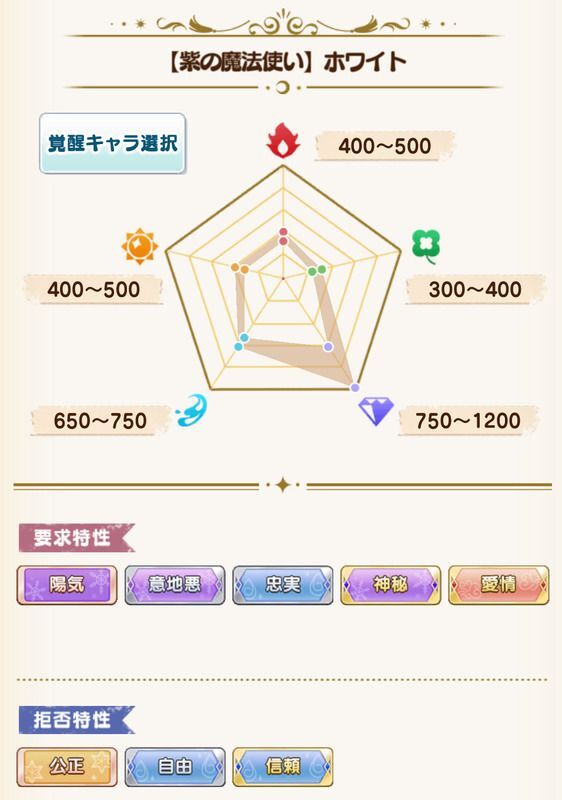 | 要求特性 | 陽気/意地悪/忠実/神秘/愛情 |