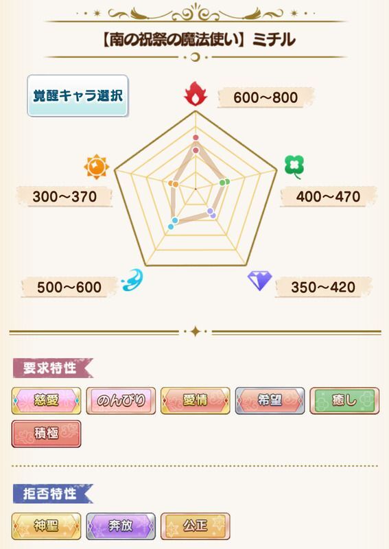 | 要求特性 | 慈愛/のんびり/愛情/希望/癒し/積極 |