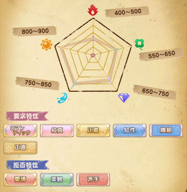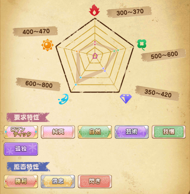 | シャイロック | 400~500 | 800~900 | 550~650 | 750~850 | 650~750 | ロマンティック/純真/正義/知性/繊細/正直 愛情/楽観/派手 |
