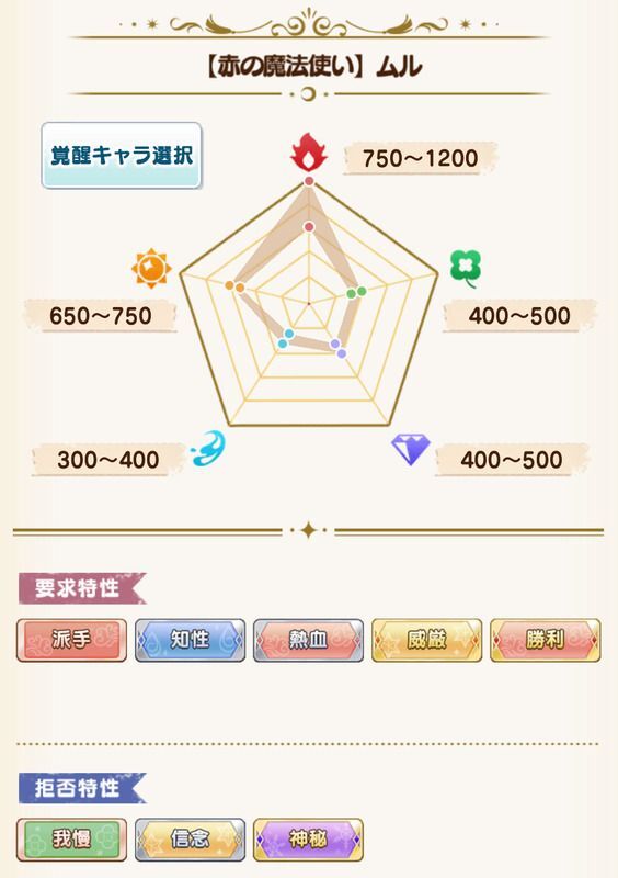 | 要求特性 | 派手/知性/熱血/威厳/勝利 |