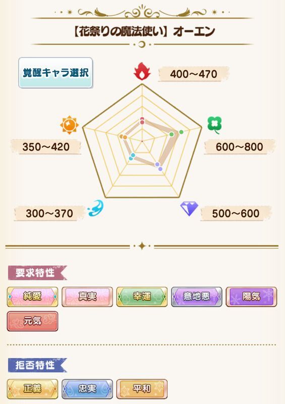 | 要求特性 | 純愛/真実/幸運/意地悪/陽気/元気 |