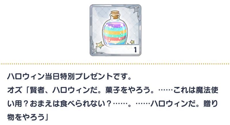 | ルチル | 賢者様、トリックオアトリート!……あはは!びっくりしてる!まさか私は言わないだろうって油断したお顔だったので、ついつい。ふふふ、私だってたまには悪戯するんですよ |