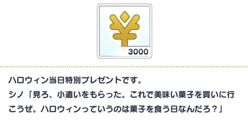 | シノ | トリックオア……!?言い切るまえに菓子をくれるなんて。さすがだな、賢者 |