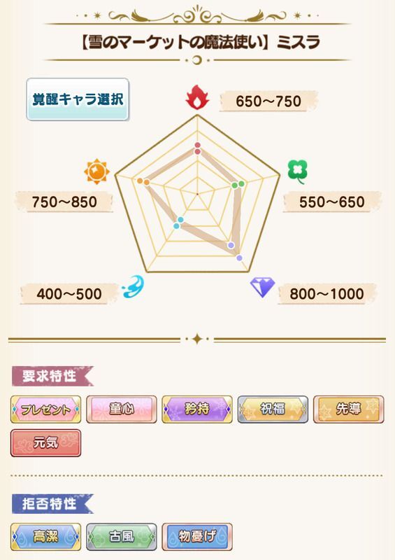 | 要求特性 | プレゼント/童心/矜持/祝福/先導/元気 |