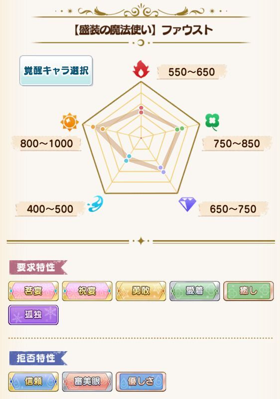 | 要求特性 | 茗宴/祝宴/勇敢/愛着/癒し/孤独 |