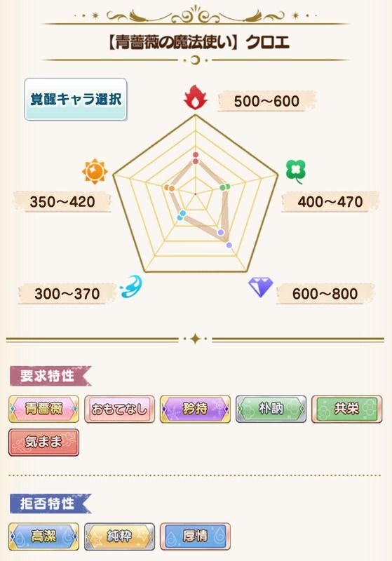| 要求特性 | 青薔薇/おもてなし/矜持/朴訥/共栄/気まま |
