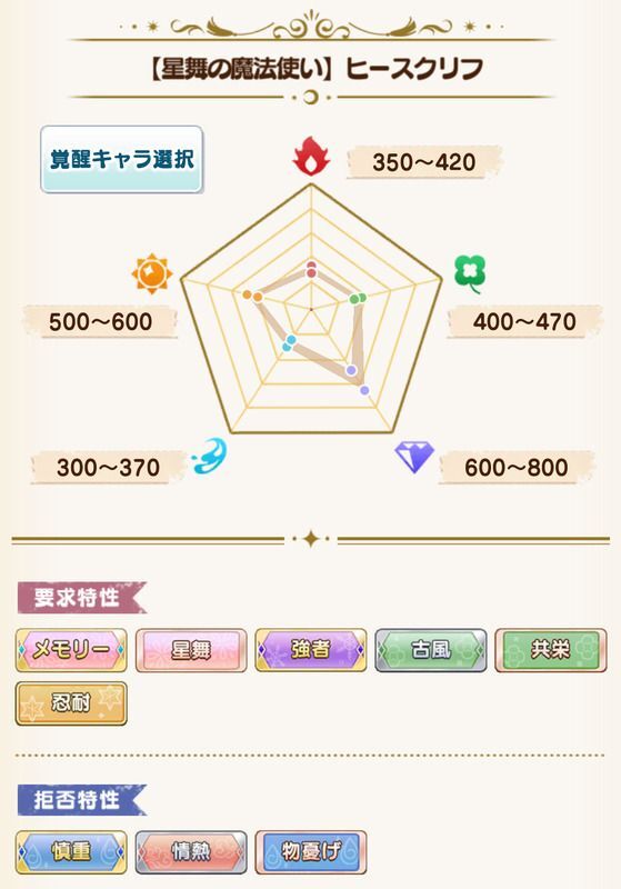 | 要求特性 | メモリー/星舞/強者/古風/共栄/忍耐 |