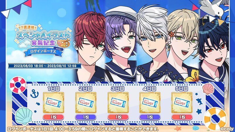 | 17週連続! スペシャルイラスト実装記念 ログインボーナス week1 | 8/3 18:00 〜8/10 12:59 |
