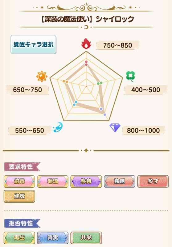 | 成長で獲得する特性 | 神秘/絢爛/自尊心/忍耐 |