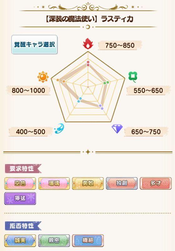 | 要求特性 | 空色/瑠璃/勇敢/独創/多才/獰猛 |