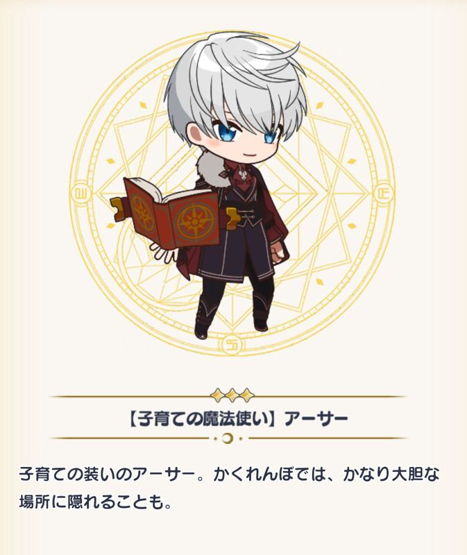 | 洞から抱き上げたそれは | 鍛錬場 Lv.1 | スコアの5.6%を基準に、次に行動を行う味方の魔法使い2人分のスキル発動率をUPする。パーティに中央の国の魔法使いが2体編成されている場合、追加で+11.8%。このスキルは16%の確率で発動する。 | |