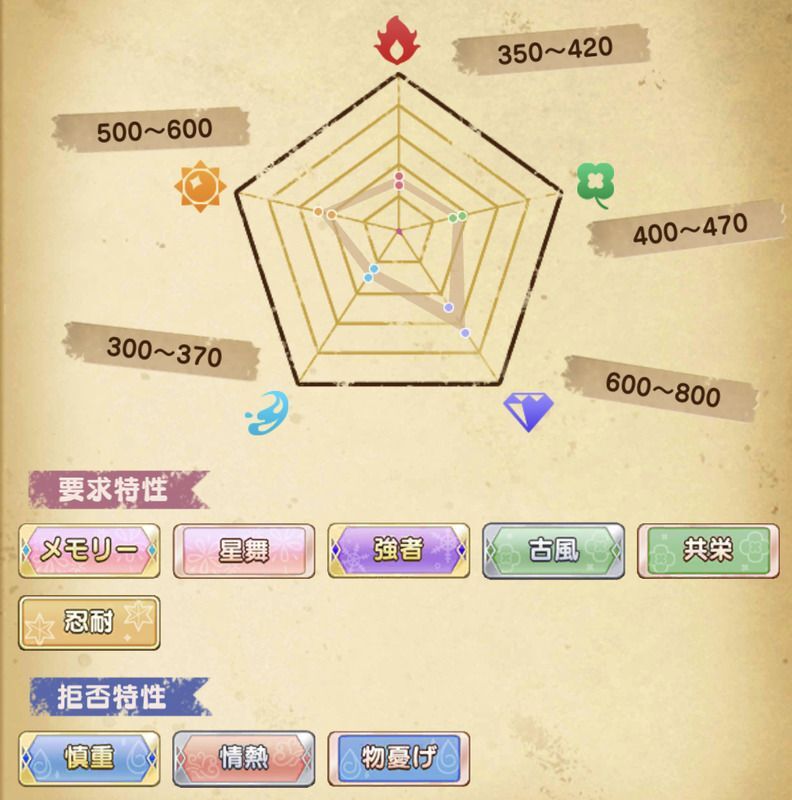 なお、舞台有利属性はハッピー・リラックス・プライド、有利特性は団結/強者/正義となっています。可能であれば優先してパラメータを伸ばし、特性を付与すると良いでしょう。