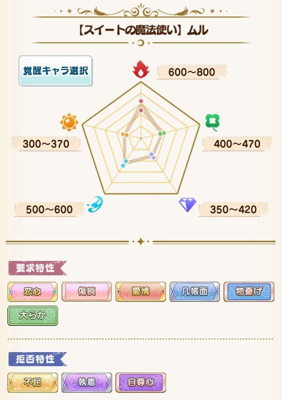 | ☆3 ムル | 600 ~ 800 | 300 ~ 370 | 400 ~ 470 | 500 ~ 600 | 350 ~ 420 | 恋心/傷痕/愛情/几帳面/物憂げ/大らか |