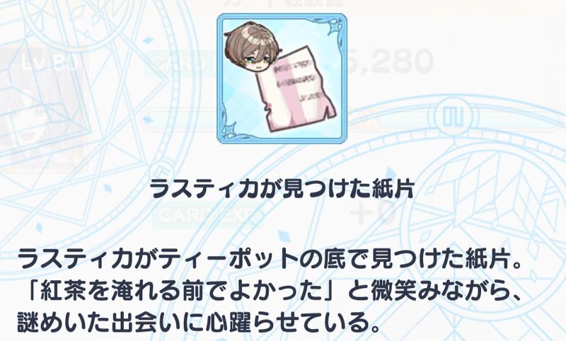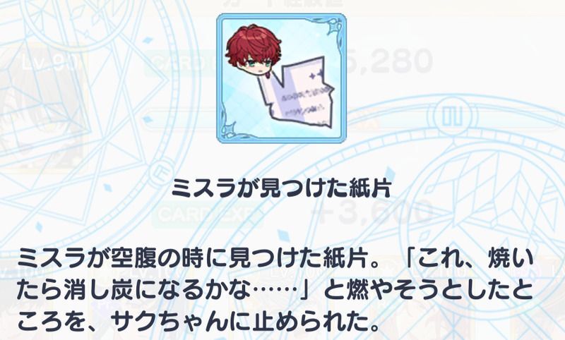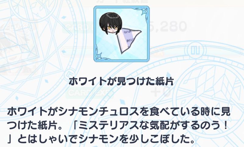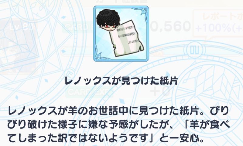 | ・フィガロが見つけた紙片 ・ルチルが見つけた紙片 ・レノックスが見つけた紙片 ・ミチルが見つけた紙片 ・任意のアイテム |