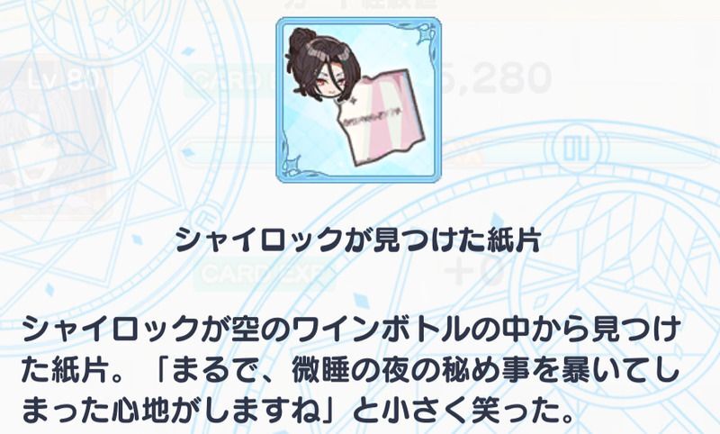 | ・シャイロックが見つけた紙片 ・ムルが見つけた紙片 ・クロエが見つけた紙片 ・ラスティカが見つけた紙片 ・任意のアイテム |