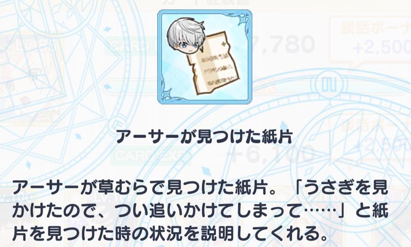 | ・オズが見つけた紙片 ・アーサーが見つけた紙片 ・カインが見つけた紙片 ・リケが見つけた紙片 ・任意のアイテム |
