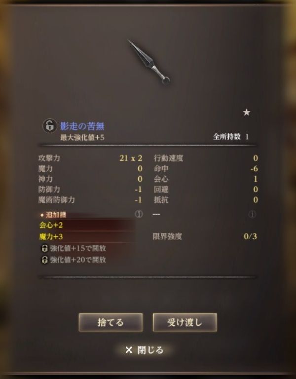 | 冥鋼の短剣 | 45 | ×2 | 0 | 0 | 0 | 4 | 15 | 0 | 2 |