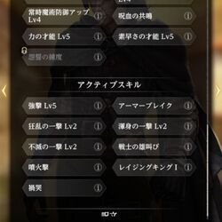 | Lv36 | 闘志 HPが一定以下の時、命中・回避・会心が上昇する スキルLvに応じて、命中・回避・会心がさらに上昇 |