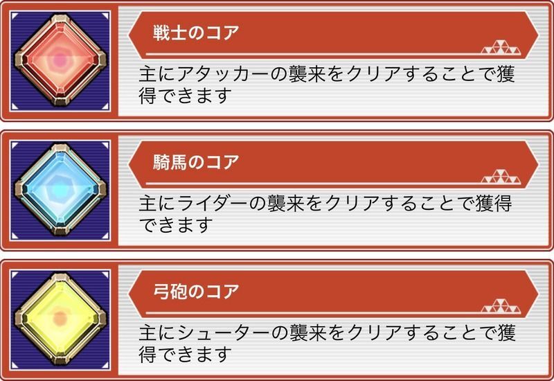- 戦士・騎馬・弓砲のコアはボスバトルや襲来で入手できます。
