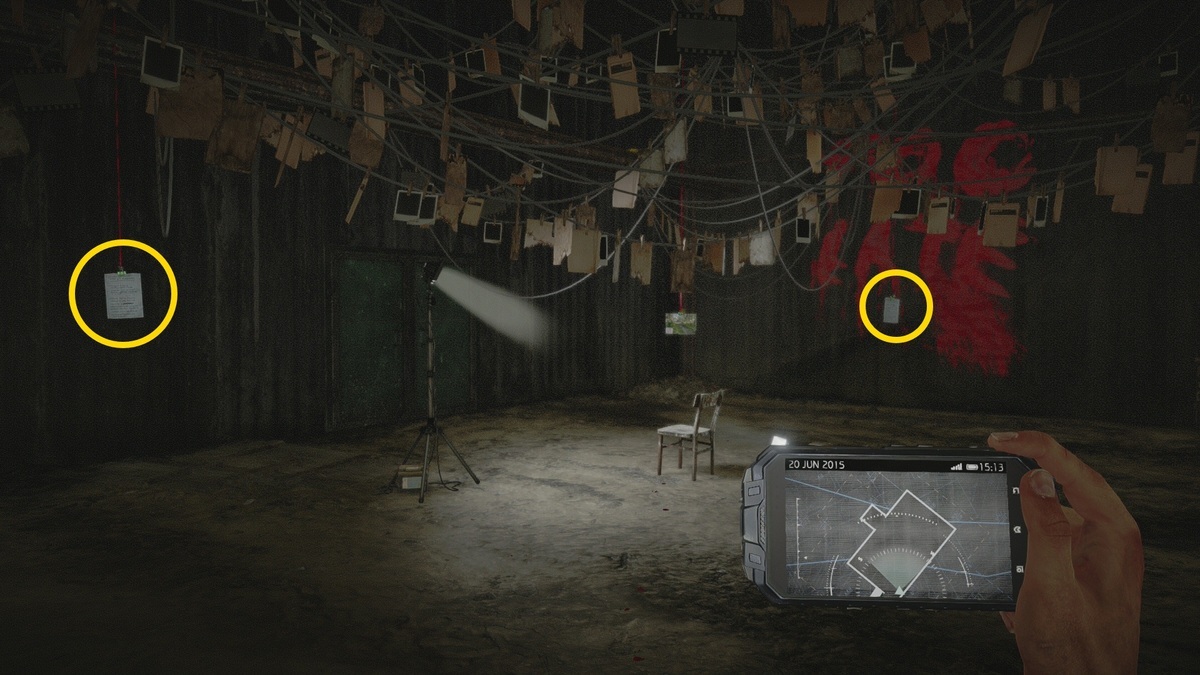 - 頭上のロープにたくさんの資料がぶら下がっている中、割と低いところに2枚のメモと1枚の写真がぶら下がっているので、2枚のメモ をそれぞれ確認
