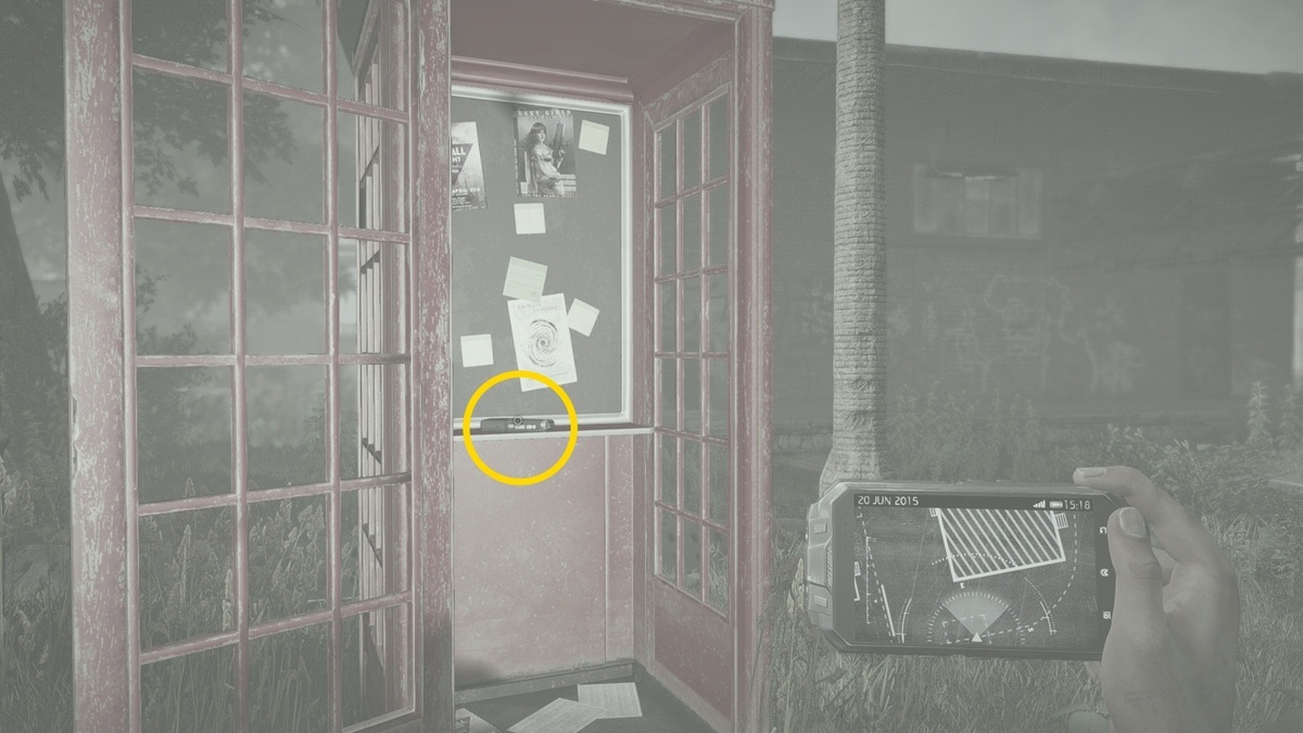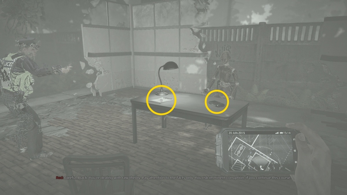 - 5体の死体があるが、数字札「4」の緑色のスウェットを着た死体をスキャン(このスキャンは収集物としてカウントされない)