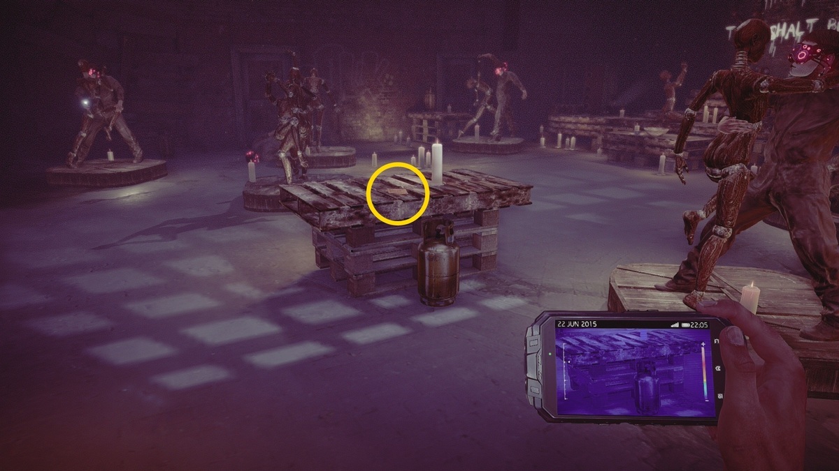 - サーモグラフィーアプリを起動すると左から2番目の患者だけ熱反応があるので始末すると 実績「Eyes of a cat」 解除