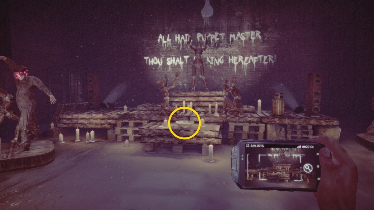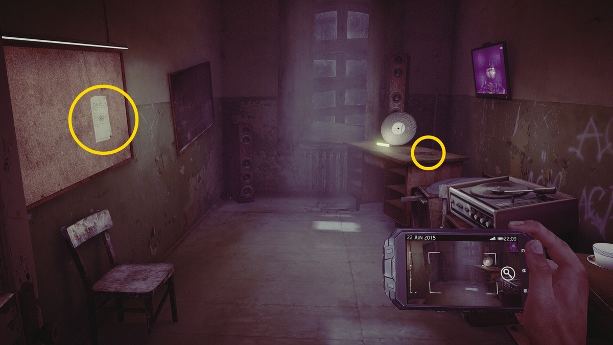 - 部屋の奥の壁までいくと5個のアイテム(メモ2通、メール1通、GPS 1通、ハワードの記事1枚)がある