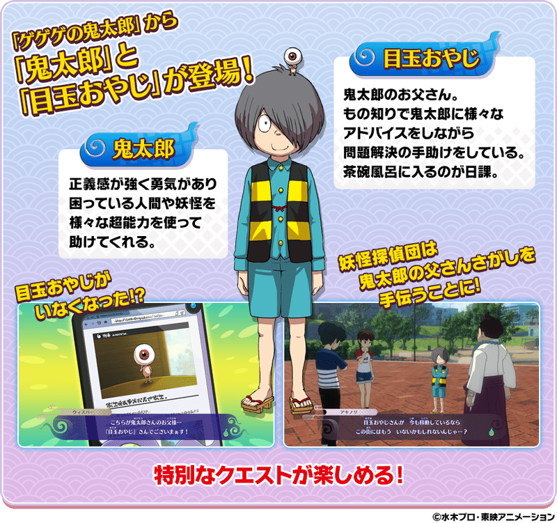 ゲゲゲの鬼太郎は特定のクエストで出現する。ケータたちと鬼太郎の交流を楽しもう。