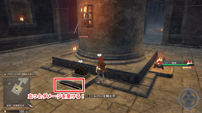 | こちらはレバーの手前に立つと槍が突き出してダメージを受けるので横から引こう。 | |