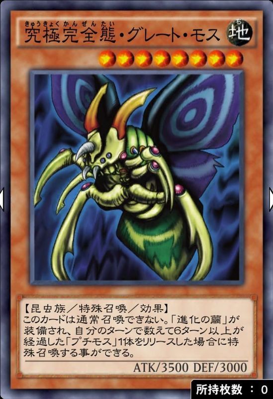このカードは通常召喚できない。「進化の繭」が装備され、自分のターンで数えて6ターン以上が経過した「プチモス」1体をリリースした場合に特殊召喚する事ができる。