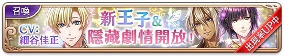- 配合兩位王子的隱藏劇情登場,於2016/03/02(三)10:00 ~ 2016/03/09(三)10:00}進行王子召喚,遇見「★5‧綠‧蓋伊里」和「★5‧藍‧吉爾巴德」的機率將會大幅提升。