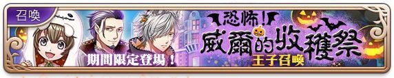 | 1 | 活動期間進行王子召喚,就有機會遇見『恐怖!威爾的收穫祭』的連動王子【★5‧藍‧維姆】【★4‧紫‧亞爾弗列德】【☆3‧黃‧普羅奇溫】,並且遇見機率大幅提升至2016/10/19 (三)10:00為止。 |