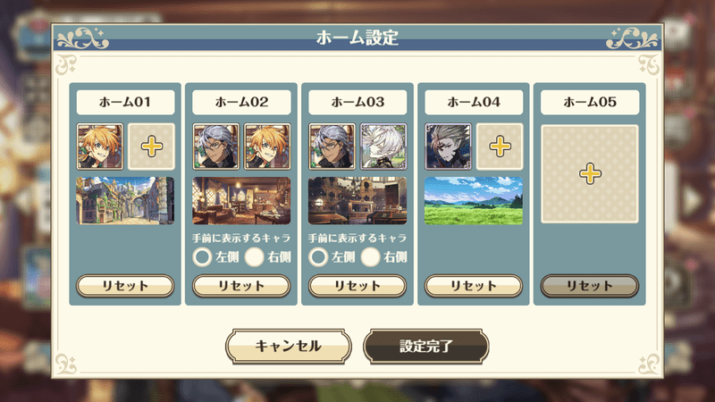 また、1人のキャラを複数のホームに設定することもできるため、1人は固定でもう1人を変えて5パターン設定するのもありです。