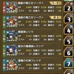 参考程度に、ストーリーのラスボスを倒すのに使用した編成を貼ります。始めたばかりで雷がいなくて困ってましたが、ディスペルとシールドブレイクを持っていたらクリアできると思われます。以下の編成ではフレンドリーヴァで、リラでシールドブレイクし、リーヴァたちでひたすらタコ殴りにする編成です。レクシアは相手が行動したらディスペルを打ち、それ以外の時は3技を打ってました。フレイヤはスロウを打つだけです。リラはボスで一度シールドブレイク打ったら解除される前に倒せるので落ちても問題ありません。