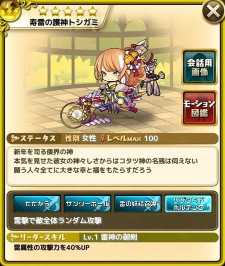 | レア度 | ★5 | 属性 | 雷 | 最大Lv | 100 |