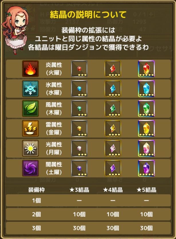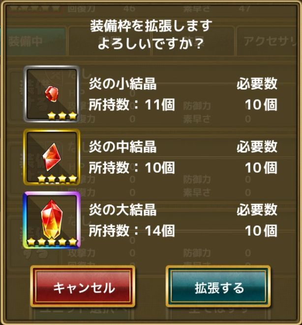 - 装備枠の拡張は、それぞれのユニットの属性に応じた「結晶」を必要数消費することで行うことが出来ます。