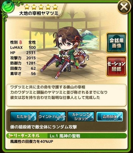 | レア度 | ★5 | 属性 | 風 | 最大Lv | 100 |