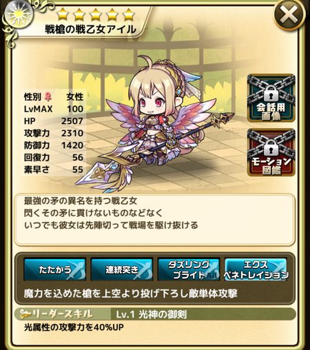| 最強の矛の異名を持つ戦乙女 閃くその矛に貫けないものなどなく いつでも彼女は先陣切って戦場を駆け抜ける | |